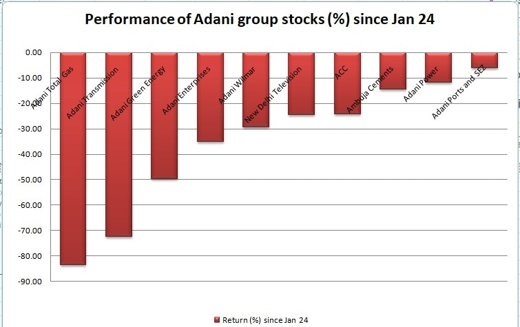 Shares of Adani Total Gas Ltd are down 83.68 per cent since January 24. Adani Transmission Ltd is down 73 per cent, Adani Total Green Ltd 50 per cent, Adani Enterprises Ltd 35 per cent and Adani Wilmar Ltd 30 per cent. Shares of Adani Ports & SEZ Ltd are least impact, down mere 6 per cent from January 24 levels. Adani Power and Ambuja Cements (down 11-14 per cent) are other least impacted group shares since.