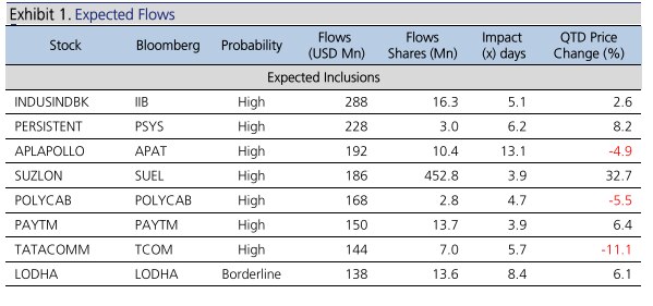 Polycab India ($168 million) and Paytm ($150 million) are two other stocks that are seen attracting over $150 million inflows on MSCI inclusion, if any. Tata Communications and Macrotech Developers Ltd (Lodha), two other potential MSCI inclusions, could also see inflows of $144 million and $138 million, respectively. JM Financial sees borderline chances of Lodha making it into the MSCI India Standard index.