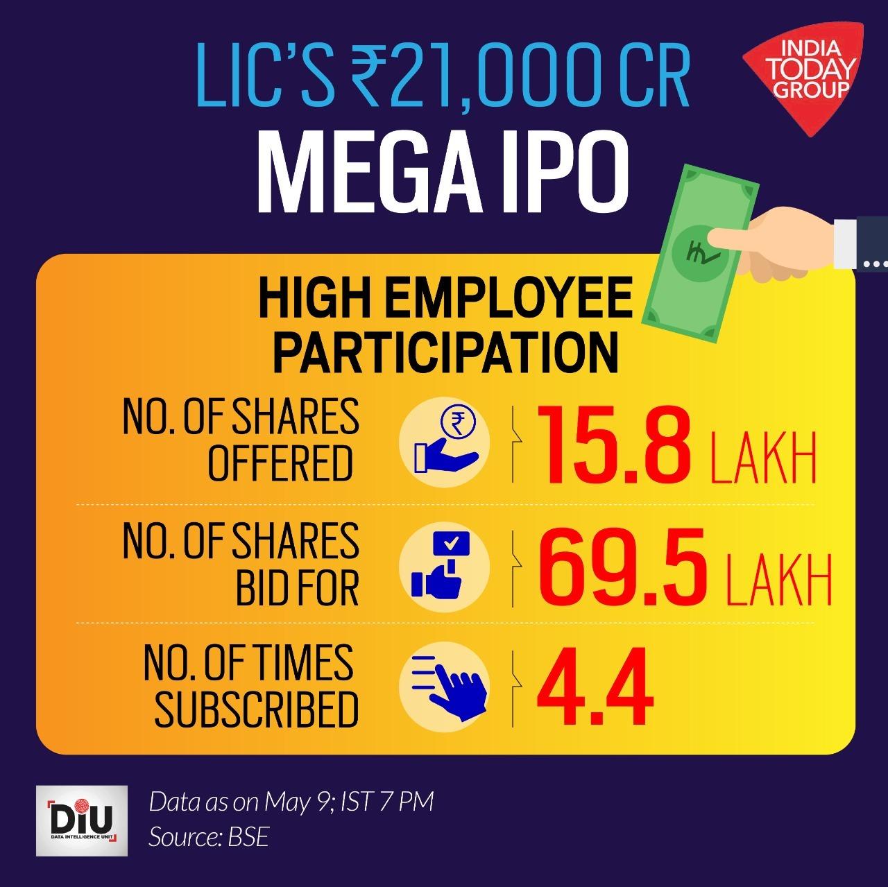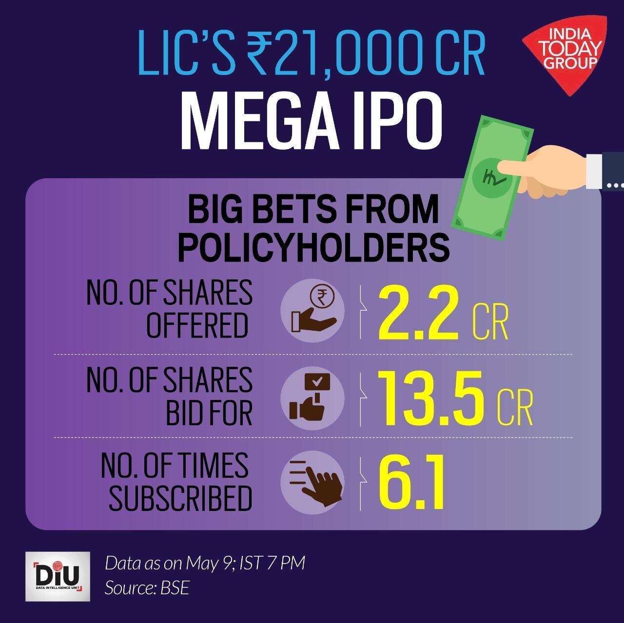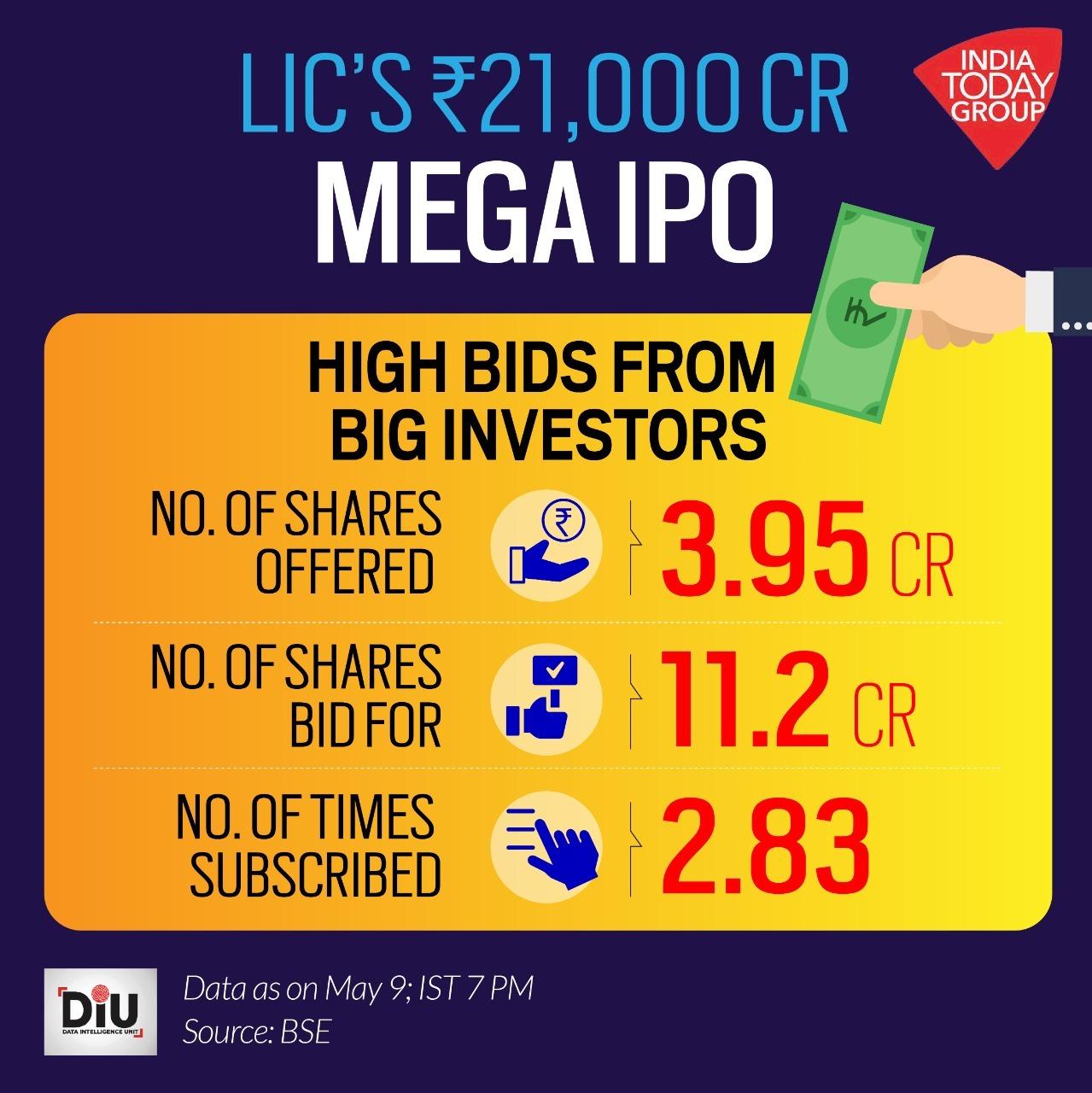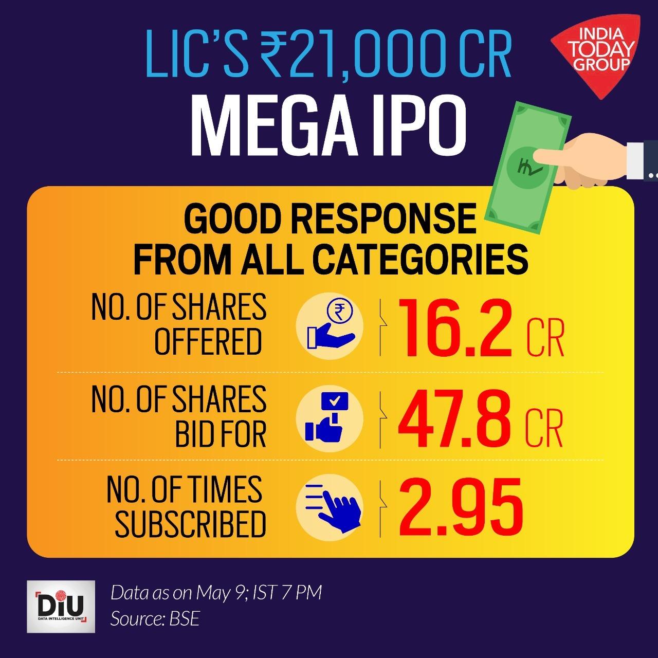 Against 16,20,78,067 shares on offer, 47,83,25,760 bids were received, according to the data posted on stock exchanges at 7 pm.The initial public offer of insurer Life Insurance Corporation of India (LIC), which is the country's biggest public offer, was subscribed 2.95 times on the ultimate day of the offer on Monday, led by policyholders at 6.1 times and employees at 4.4 times. It received a total bid of Rs 45,379 crore against the offering of Rs 15,391 crore.
