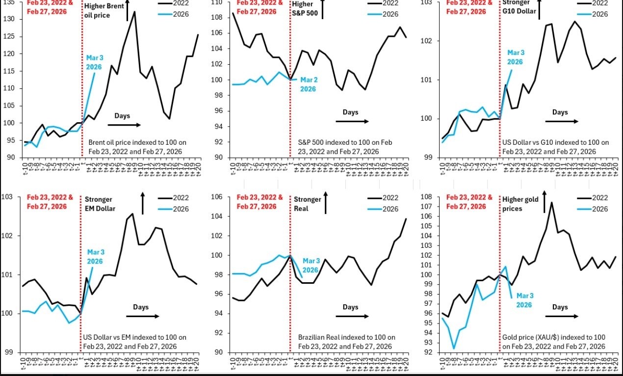 Brooks analysed six market indicators in event time, comparing price action around the Ukraine invasion with recent movements. The data included Brent crude, the S&P 500, the US dollar against G10 and emerging market currencies, the Brazilian real, and gold prices. Each series was indexed to 100 on the day preceding the respective shock to allow for direct comparison.