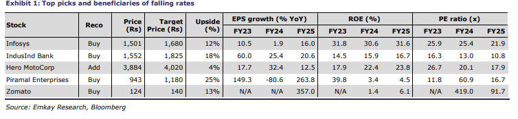 "The best beneficiaries of falling rates are mid-size lenders (IndusInd Bank) and IT (Infosys), while our other top picks are Hero MotoCorp, Piramal Enterprises, and Zomato (new addition)," the domestic brokerage said.