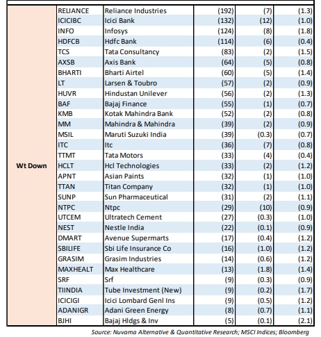 Mahindra & Mahindra Ltd, Maruti Suzuki India Ltd, ITC Ltd, Tata Motors Ltd, HCL Technologies Ltd, Asian Paints Ltd, Titan Company Ltd and Sun Pharmaceutical Industries are some other names that may see outflows because of the MSCI rejig.