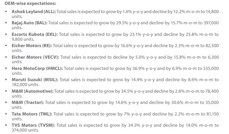Sharekhan said the broader trend in PV and commercial vehicle (CV) segment may continue, with the demand in the premium segment continuing to be strong while entry-level demand lagging. Sharekhan said it would be important is to watch if there is an improvement in volume mix than that of absolute volume growth, as the improvement in product mix would augur well for profitability. It likes auto stocks such as Ashok Leyland, Tata Motors, Bajaj Auto, Maruti Suzuki and Escorts.