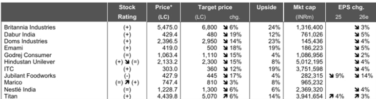 BNP's preferred consumer picks included Britannia Industries, Titan and DOMS Industries and suggested 14-24 per cent upside targets. The brokerage has downgraded HUL, which has been a laggard in growth and faces a relatively higher cost inflation. It upgraded Marico, which it said is well-positioned for margin uptick amid Copra Downcycle.