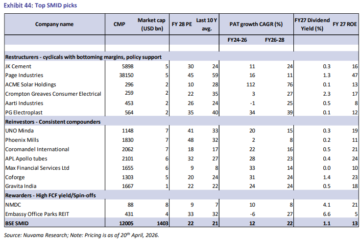 Nuvama classified these stocks into three groups. The first, termed ‘Restructurers’, included cyclicals with bottoming margins and policy support. The second category, ‘Reinvestors’, comprised consistent compounders, while the third, ‘Rewarders’, included companies with high free cash flow yields. Embassy Office Parks REIT and NMDC Ltd were grouped under ‘Rewarders’. UNO Minda, Coromandel International Ltd and Coforge Ltd were categorised as ‘Reinvestors’, while Page Industries Ltd and PG Electroplast Ltd were identified as ‘Restructurers’.