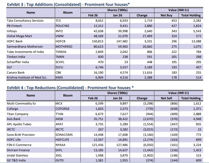 Additional buying was also seen in Samvardhana Motherson, Tube Investments of India, Timken India, Schaeffler India, DLF and Canara Bank. Four prominent private insurers, HDFC Life Insurance Company Ltd, ICICI Prudential Life Insurance Company Ltd, Kotak Mahindra Life Insurance Company Ltd and Tata AIA Life Insurance Company Ltd, together made selective portfolio adjustments in February, adding shares of large-cap IT and banking names such as Tata Consultancy Services Ltd (TCS), Infosys Ltd and HDFC Bank Ltd, while trimming holdings in stocks including Multi Commodity Exchange of India Ltd (MCX), Coforge Ltd and Indian Railway Catering and Tourism Corporation Ltd (IRCTC), according to data compiled by Nuvama Institutional Equities.