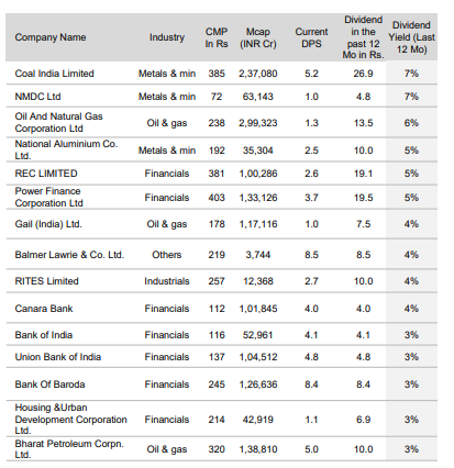 Nalco, REC and PFC offered Rs 10-19.50 per share dividends in the past 12 months and commanded dividend yields of 5 per cent each.