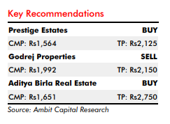 The brokerage said consolidation in the sector has kept demand momentum healthy, but added that it remained watchful on sales velocity amid rising unaffordability and increasing business development costs as a percentage of gross development value, especially given the high growth guidance provided by companies under coverage. Ambit said it preferred Prestige Estates and ABREL among large and mid-cap real estate players.