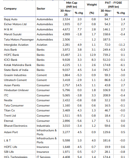 In November 2025, 22 Nifty50 companies, or 44 per cent of the index, saw cuts in their FY26E earnings per share (EPS) estimates. The declines were concentrated in several large sectors, with Pharmaceuticals and Cement recording the highest incidence of downgrades, as all companies under coverage in these sectors faced cuts. Aviation, represented by a single company, also saw its FY26E EPS reduced. Metals and Mining saw three of four companies downgraded, while half of the NBFC, Utilities, and Insurance companies experienced reductions.