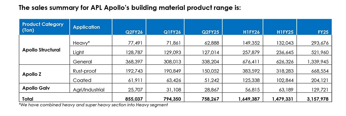 APL Apollo Tubes shares gained 1.84% to Rs 1717.20 in the current session. Shares of APL Apollo Tubes gained nearly 2% on Wednesday after the structural steel tube company said it clocked all-time high sales volume for Q2FY26.