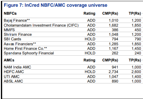 InCred Equities added Home First Finance Company India Ltd and Aavas Financiers to its high-conviction list and suggested targets of Rs 1,450 and Rs 1,850, respectively. It retained Bajaj Finance in its list with an 'Add' rating and a target price of Rs 1,200. It is positive on vehicle financiers Shriram Finance, Mahindra & Mahindra Financial Services Ltd and Cholamandalam Investment & Finance Company. The domestic brokerage upgraded Cholamandalam Investment to 'Add' and SBI Card to Hold. It retained Hold on Spandana Sphoorty Financial.