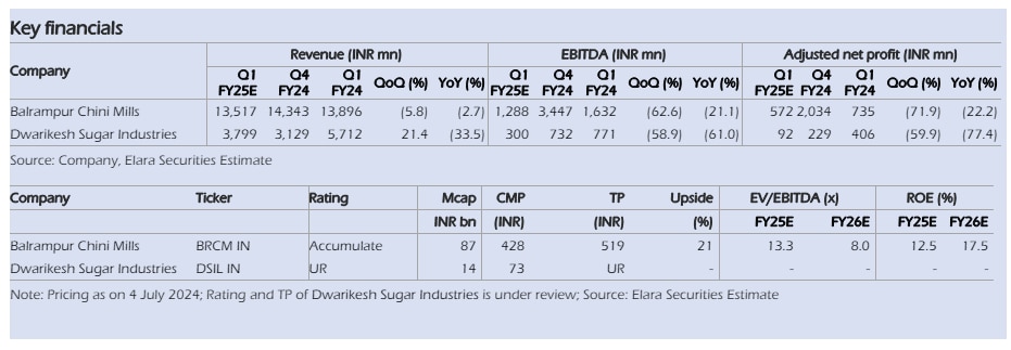 For Balrampur Chini, Elara sees adjusted net profit declining 22.2 per cent to Rs 57.20 crore for the June quarter from Rs 73.50 crore in the same quarter last year. It sees sales falling 2.7 per cent YoY to Rs 1,351 crore. from Rs 1,387 crore YoY. The brokerage has an 'Accumulate' rating on Balrampur Chini Mills.