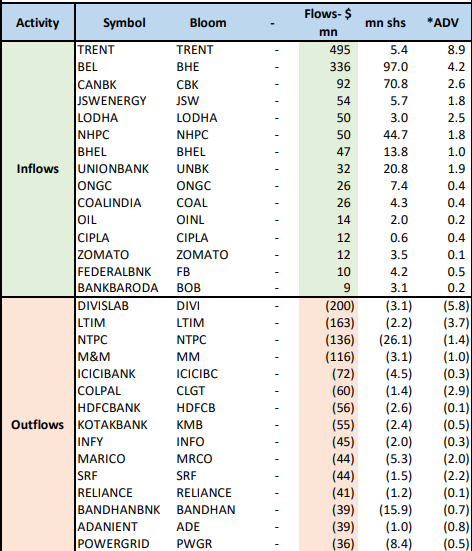 On a cumulative basis, Trent is seen attracting $495 million inflows, while BEL is seen attracting $336 million inflows on Nifty50 inclusion. Nifty stocks such Cipla and HDFC Life may see insignificant inflows on increase in weights, while others such as Mahindra & Mahindra, Infosys Ltd, ICICI Bank Ltd, Reliance Industries Ltd, Adani Enterprises Ltd, HDFC Bank Ltd and Bharti Airtel Ltd, among others, may see passive outflows on weight reductions.