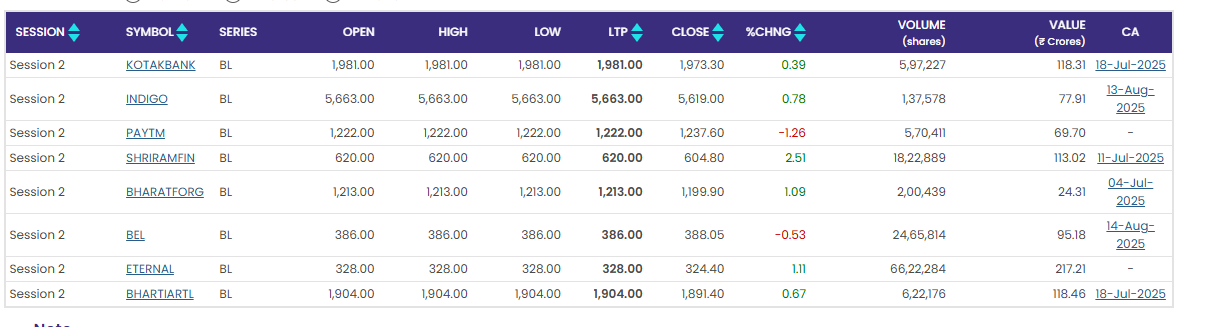Bharti Airtel was up 1.21 per cent at Rs 1,914.10. Kotak Bank was flat at Rs 1,972.10. Shriram Finance climbed 2.53 per cent at Rs 620.10. Eternal (Zomato), Bharti Airtel Ltd, Kotak Mahindra Bank and Shriram Finance are some of the stocks seeing block deals on Thursday to the tune of Rs 120-220 crore, NSE data showed. Bharat Electronics (BEL) One 97 Communications (Paytm) InterGlobe Aviation (IndiGo) and Bharat Forge also saw block deals today. These eight shares got traded in the afternoon block deal window, which operate between 02:05 PM to 2:20 PM.