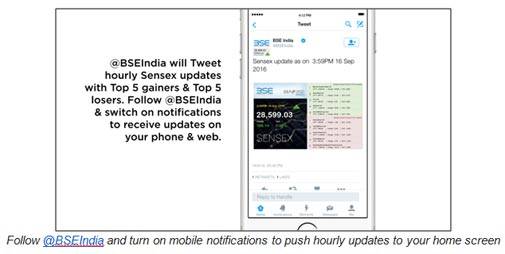During trading hours (9 am to 3.30 pm), @BSEIndia will send hourly Tweet updates of the Sensex figures, level, and Top 5 gainers and Top 5 losers. People can stay notified by following @BSEIndia and turning on mobile notifications for the account.