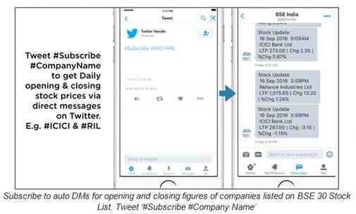 You can also subscribe to a special Direct Message subscription facility for Daily Opening and Closing stock price for Sensex 30 companies. You can activate this facility by Tweeting '#Subscribe #CompanyName'. The official hashtags for companies on the BSE 30 Stock List are listed on www.bseindia.com.