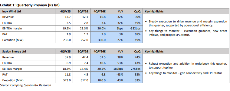 On Inox Wind, Systematix anticipated 4QFY26 consolidated revenue of Rs 1,680 crore, up 32 per cent YoY or 39 per cent QoQ, based on 300MW order execution during the quarter.