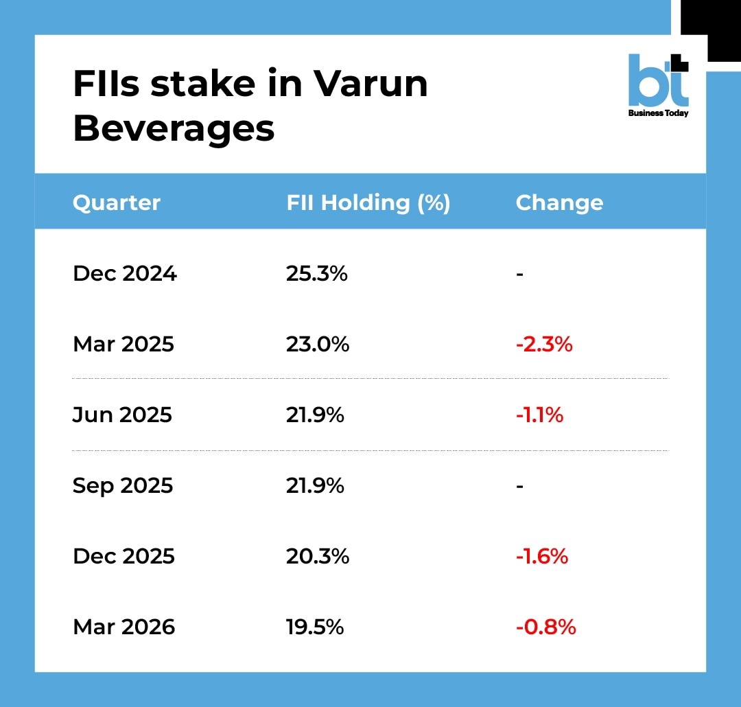 Varun Beverages stock has a beta of 1.06%, indicating high volatility in a year. Pic source: (AI generated pic for representational purposes)Shares of Varun Beverages have slipped 30% in the last five quarters with FII holding in the PepsiCo bottler, falling to its lowest since the December 2024 quarter. FIIs stake in the March 2026 quarter fell to 19.5% against the foreign holding stake of 25.3% in the December 2024 quarter.