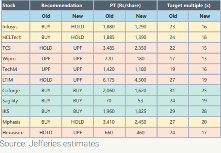 Jefferies has suggested fresh targets of Rs 1,290 for Infosys, Rs 1,390 for HCL Tech, Rs 2,450 for Mphasis, Rs 4,300 for LTIM, Rs 2,350 for TCS and Rs 460 for Hexaware Technologies.