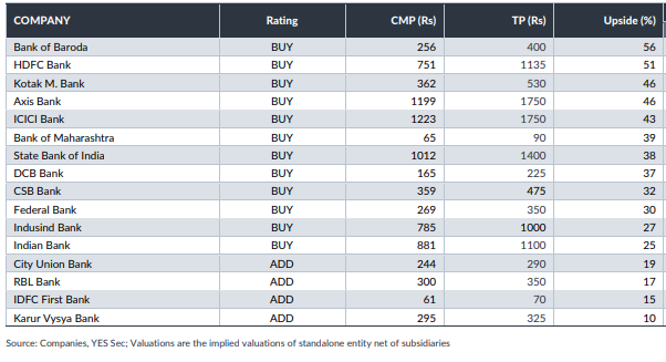 The brokerage suggested a target of Rs 400 on BoB, Rs 1,135 on HDFC Bank, Rs 530 on Kotak Mahindra Bank and Rs 1,750 each on Axis Bank and ICICI Bank, suggesting 43-56 per cent potential upside.