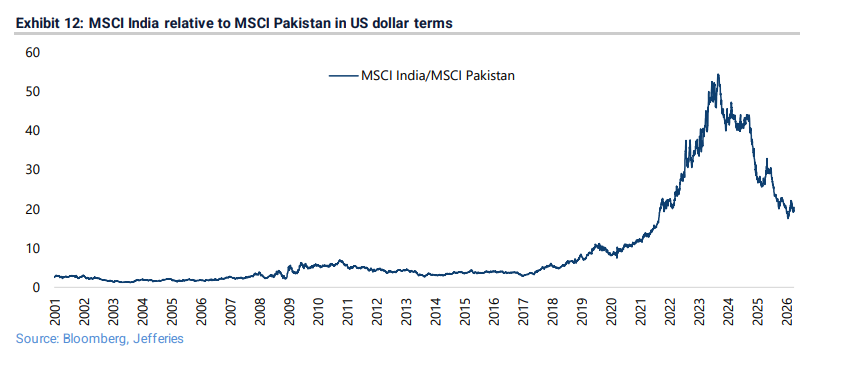 Jefferies said Pakistan can be a profitable stock market to trade around IMF bailout cycles.Christopher Wood of Jefferies in his latest GREED & fear note said Indian stock market has outperformed Pakistan shares by 653 per cent in dollar terms since the start of this century. This is even the MSCI Pakistan index is up 84 per cent in dollar terms since the last IMF programme in September 2024, a period in which it has outperformed the MSCI India by 124 per cent.