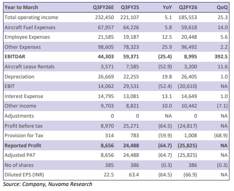 Nuvama said Q3FY26 EbitdaR is expected to decline 25 per cent YoY, driven by a 4 per cent YoY fall in yields and a 26 per cent YoY increase in operating expenses. The rise in costs was largely due to forex losses of about Rs 1,100 crore and FDTL-related disruption costs of around Rs 830 crore incurred in December 2025, Nuvama said.