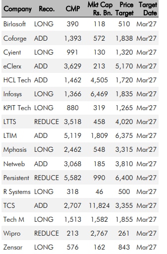 Equirus said it preferred Infosys Ltd, Tata Consultancy Services (TCS), HCL Technologies Ltd and Tech Mahindra Ltd among large caps. It likes Mphasis Ltd and Zensar Tech among midcaps, and KPIT within ER&D on a relative basis. It cautioned that a higher-than-expected impact from AI remains a key downside risk.