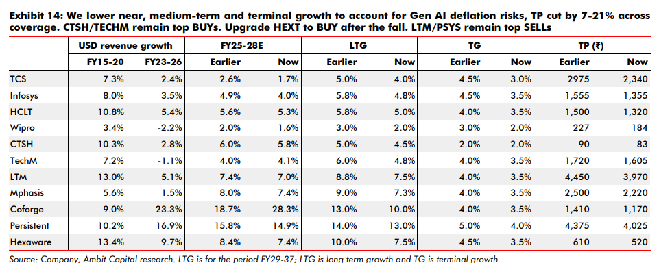 Ambit Capital said demand issues are beyond just Gen AI, with macro and crowding out of IT Services, despite benign tech spending. Gen AI deflation, need to evaluate alternative approaches and macro could affect near/mid-term and terminal growth, it warned.