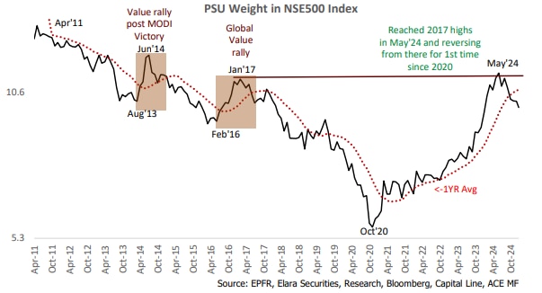 To be sure, the PSU weight in the NSE500 expanded from 8 per cent to 12 per cent between August 2023 and May 2024 period, which created a vicious chasing cycle. But the weight of PSUs has started dropping now and the pressure on fund managers to own PSUs has waned, Elara Securities said in a note.