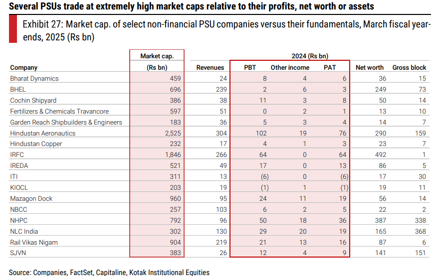 Kotak Institutional Equities in a note said several PSUs trade at extremely high market caps relative to their profits, net worth or assets. They include Bharat Dynamics Ltd (BDL), Cochin Shipyard, HAL, IRFC, IREDA, Mazagon Dock, NBCC, NHPC and RVNL, among others.