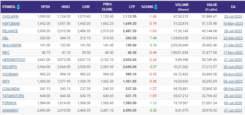 In turnover terms, Cholamandalam Investment led the chart, with Rs 478 crore turnover. Private lender HDFC Bank saw a turnover of Rs 422 crore while oil-to-telecom major Reliance Industries saw Rs 390 crore in turnover. Dilip Buildcon, Hero MotoCorp, Escorts and Infosys were among other stocks seeing high turnover in Monday's trade. These stocks gained up to 5 per cent.