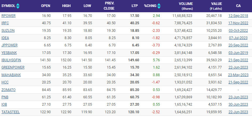 YES Bank added 0.29 per cent to Rs 123.60. A total of 3,46,11,999 YES Bank shares changed hands worth Rs 59 crore. Indiabulls Housing surged 6.19 per cent to Rs 150.20 as 2,44,54,423 shares worth Rs 364 crore changed hands. Orient Green Power, Bank of Maharashtra, HCC, IOB, Zomato, Punjab National Bank (PNB) and Tata Steel were among other stock that saw high volumes in Wednesday's trade.
