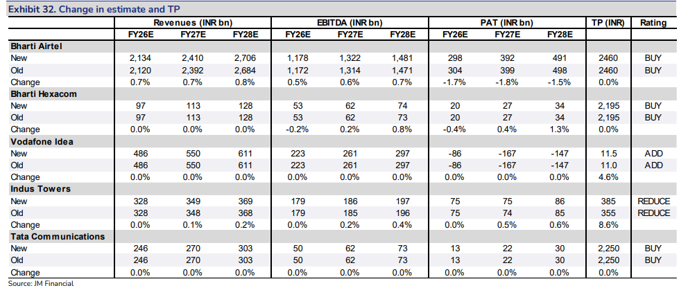 JM Financial has a target of Rs 2,460 for Bharti Airtel, Rs 2,195 for Bharti Hexacom, Rs 11 for Vodafone Idea (VIL), Rs 355 for Indus Towers and Rs 2,250 for Tata Communications.