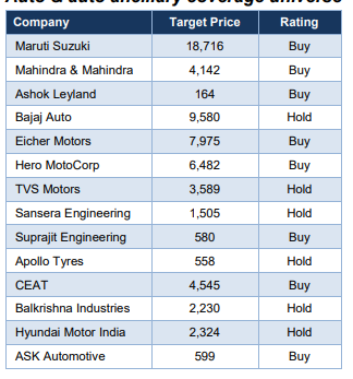 Its top recommendations are M&M (target price: Rs 4,142) and Maruti Suzuki (target: Rs 18,716) in the four-wheeler segment and Eicher Motors (target: Rs 7,975) and Hero MotoCorp (target: Rs 6,482) in the two-wheeler space. It likes ASK Automotive (target: Rs 599) and CEAT (target: Rs 4,545) in the auto components and the tyre space, respectively.