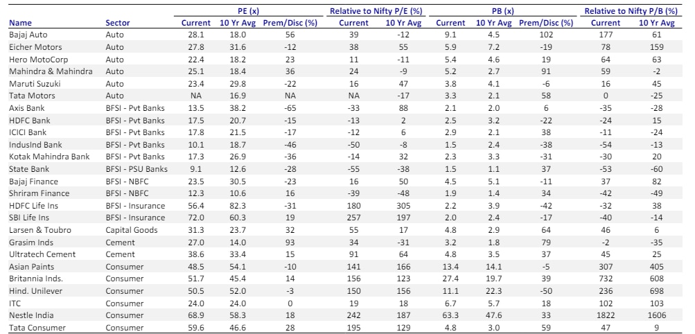On the flip side, Grasim Industries at PE of 27 times trades at 93 per cent premium over its 10-year average PE of 14 times. RIL shares at 25.6 times are trading at 65 per cent premium over its long-term average PE of 15.6 times. Bajaj Auto (56 per cent premium), Divis Lab (55 per cent premium) and Adani Ports (55 per cent premium) are some other stocks trading at steep premiums to historical averages.