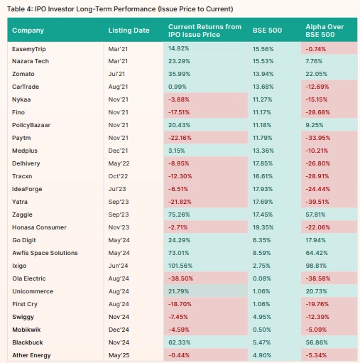 The findings reveal a dichotomy between market hype and fundamental performance. Although companies saw listing gains due to high oversubscription rates, long-term value creation was elusive for most. Positive alpha over the benchmark was generated by 43% of Pre-IPO investors, 36% of IPO investors, and only 32% of post-IPO investors. These statistics underscore the challenges faced by investors in navigating the volatile landscape of new-age IPOs.