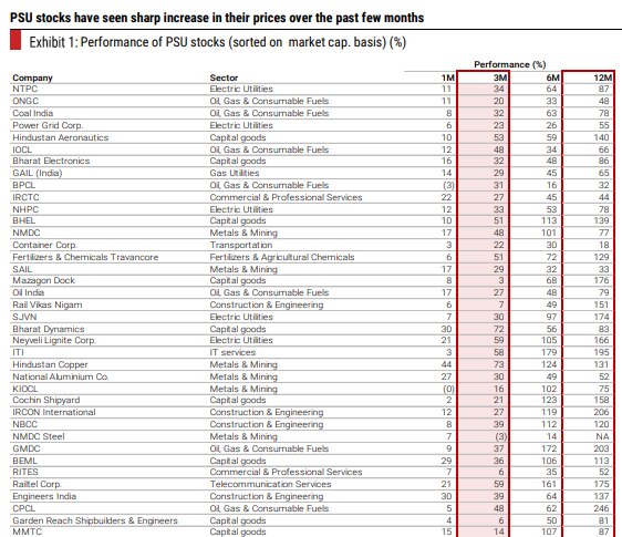 "We note that valuations of most PSUs have expanded sharply over the past few months. The high valuations of the PSUs may reduce the interest of potential bidders even assuming that the government was keen to privatise some of the PSUs. In fact, some of the possible candidates for privatization in the non-strategic sectors (metals, transportation) now trade at a large premium to their private sector peers," it said.
