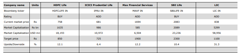 For now, Emkay Global has 'Buy' rating on HDFC Life Insurance Company Ltd (target: Rs 850) and SBI Life Insurance Company Ltd (target: Rs 2,300) and 'Add' rating on ICICI Prudential Life Insurance Company Ltd (target: Rs 725), Max Financial Services Ltd (target: Rs 1,900) and Life Insurance Corporation of India (LIC) (target: Rs 1,100).