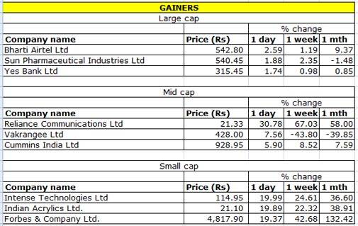 Bharti Airtel (2.59%), Sun Pharma (1.88%) and YES Bank (1.74 percent) were the top Sensex gainers on Tuesday.