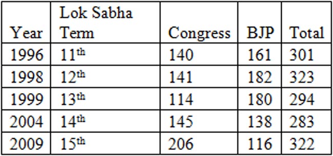 Historically in the last 18 years, the Congress and the BJP combined have never won more than 325 seats. In the same period, the highest number of seats the Congress has won has been 206 seats in 2009, while the BJP's best performance was 182 seats in 1998.