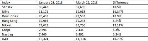 The quote 'What goes up must come down' may remind one of the Law of Gravity, but off late it seems to have become more than apt when it comes to the Indian market. Sensex and Nifty, which touched their all-time high levels in January-end this year, joined the global correction and made investors jittery over their equity investments. On January 29, 2018, Sensex and Nifty hit 36,443 and 11,171 levels, respectively reaching their lifetime highs on Union Budget expectations and hopes of healthy Q3 earnings.