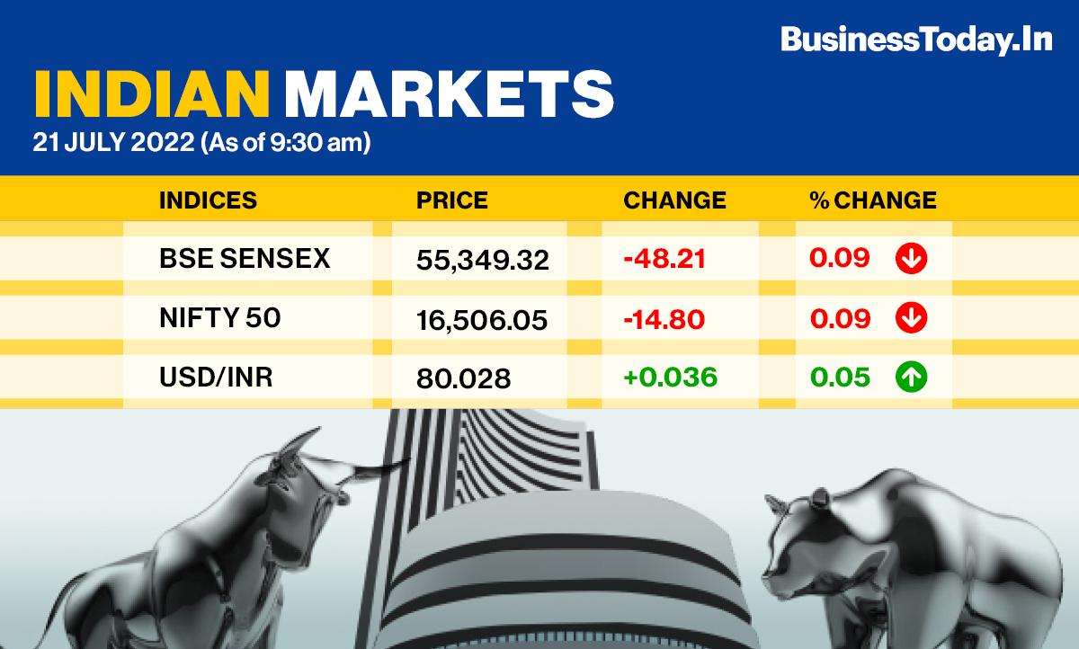Sensex falls 70 points to 55,327 and Nifty loses 7 points to 16,513 in early trade.