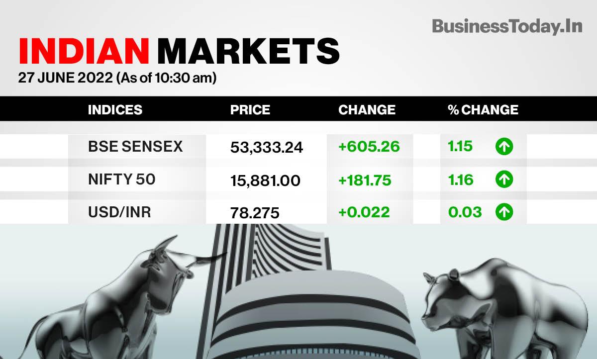 Sensex rises 616 points to 53,344 and Nifty gains 182 points to 15,882.
