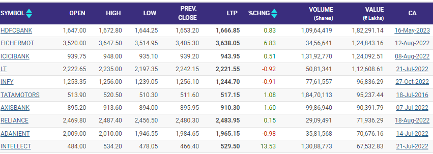 HDFC Bank led the turnover chart on NSE. The stock saw a turnover of Rs 1,822.91 crore as 1,09,64,419 shares changed hands on the counter. The scrip was up 0.83 per cent at Rs 1,666.85. Eicher Motors gained 6.83 per cent to Rs 3,638.05. The counter saw a turnover of Rs 1,248.43 crore. ICICI Bank (Rs 1,240 crore) and Larsen & Toubro (Rs 1,126 crore) were two other stocks seeing turnovers of over Rs 1,000 crore.