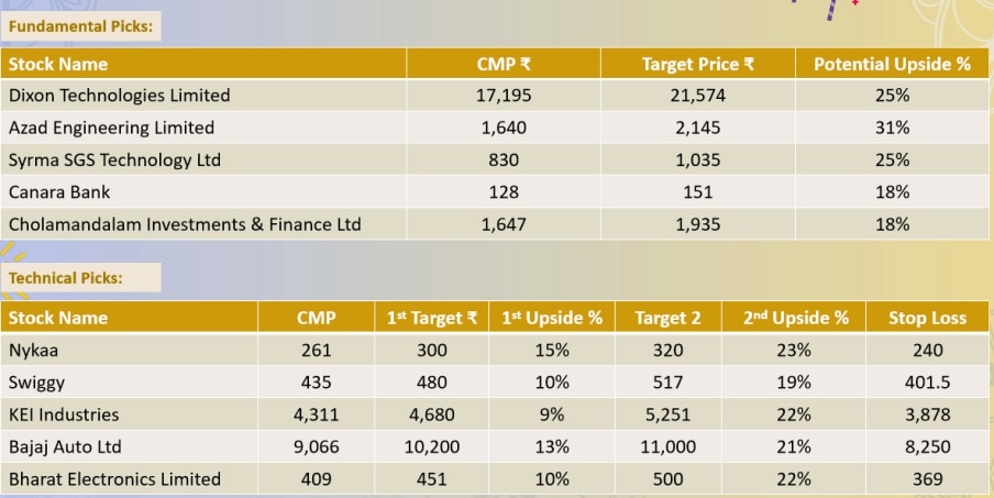 Technical ideas include Swiggy, FSN E-Commerce Ventures (Nykaa), KEI Industries, Bajaj Auto, and Bharat Electronics Ltd (BEL).Centrum Broking’s list of top 10 stock picks for Samvat 2082 featured five fundamental calls and five technical ideas. Its fundamental picks included Dixon Technologies, Azad Engineering, Syrma SGS Technology, Canara Bank, and Cholamandalam Investment & Finance Company Ltd (CIFC). Technical ideas included Swiggy, FSN E-Commerce Ventures (Nykaa), KEI Industries, Bajaj Auto, and Bharat Electronics Ltd (BEL).