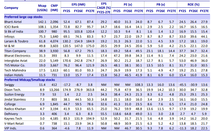 Its largecap picks include InterGlobe Aviation (IndiGo) Bharti Airtel, ICICI Bank, State Bank of India (SBI), Infosys, Larsen & Toubro (L&T), Mahindra & Mahindra (M&M) and Eternal. MOFSL said it also prefers Bharat Electronics (BEL), TVS Motors, Tech Mahindra and Indian Hotels in the largecap space.