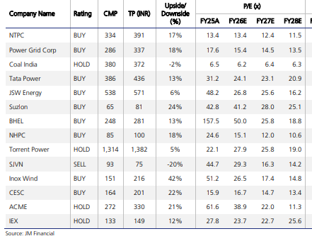 JM Financial has 'Buy' recommendation on Tata Power Company Ltd, JSW Energy, NHPC, CESC, Power Grid and BHEL.