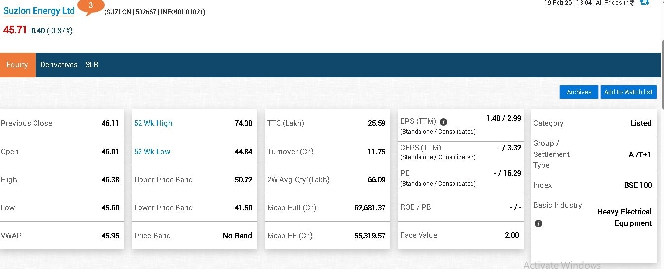 Suzlon Energy stock was trading on a flat note at Rs 45.70.