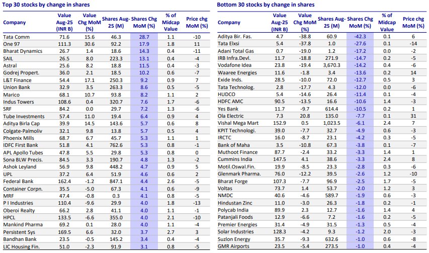 On the flip side, Tata Communications, Bharat Dynamics (BDL), One 97 Communications Ltd (Paytm), SAIL and Astral were some of the midcap stocks that fund managers increased exposure to in August, MOFSL data showed.