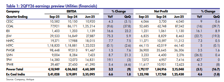 Tata Power: PAT growth is expected to rise 6 per cent YoY, supported by stronger distribution performance in Odisha and Delhi, a solar order book of Rs 16,000 crore, and contributions from newly commissioned cell and module plants.Antique Stock Broking on Monday released its Q2 FY26 earnings preview for a coverage universe of private and public sector utilities, including Tata Power, IEX, NTPC, CESC, JSW Energy, NHPC, Torrent Power, and Coal India. The brokerage expects overall Ebitda for its utilities universe (excluding Coal India) to rise 7 per cent YoY, with PAT growth of around 5 per cent YoY. Profits are projected to increase for CESC, IEX, NHPC, NTPC, Power Grid, Torrent Power, and Tata Power, while Coal India, JSW Energy, and SJVN could see PAT declines. PGCIL and CESC remained Antique's top two stock picks from the sector.